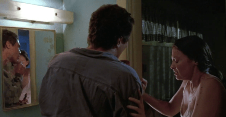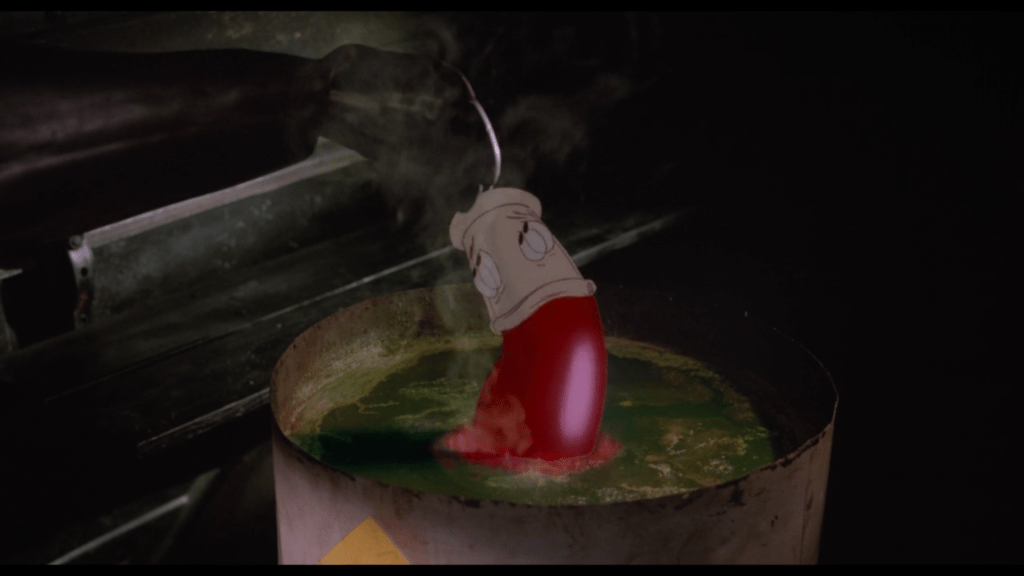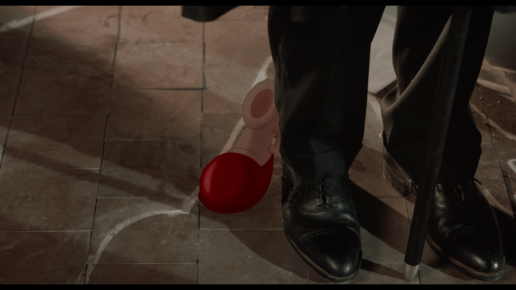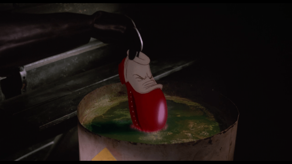 Eddie’s nemesis is the evil Judge Doom, who really hates the cartoons. Here we have a scene when a childlike shoe nuzzles his leg. Doom, illustrating that he has a new way to kill toons, picks up the shoe and melts him alive while the little feller gazes at him beseechingly. Doom emotionlessly displays his dripping red glove.