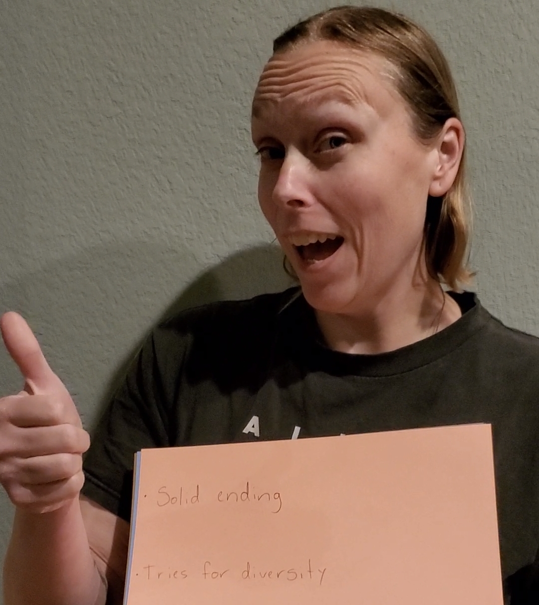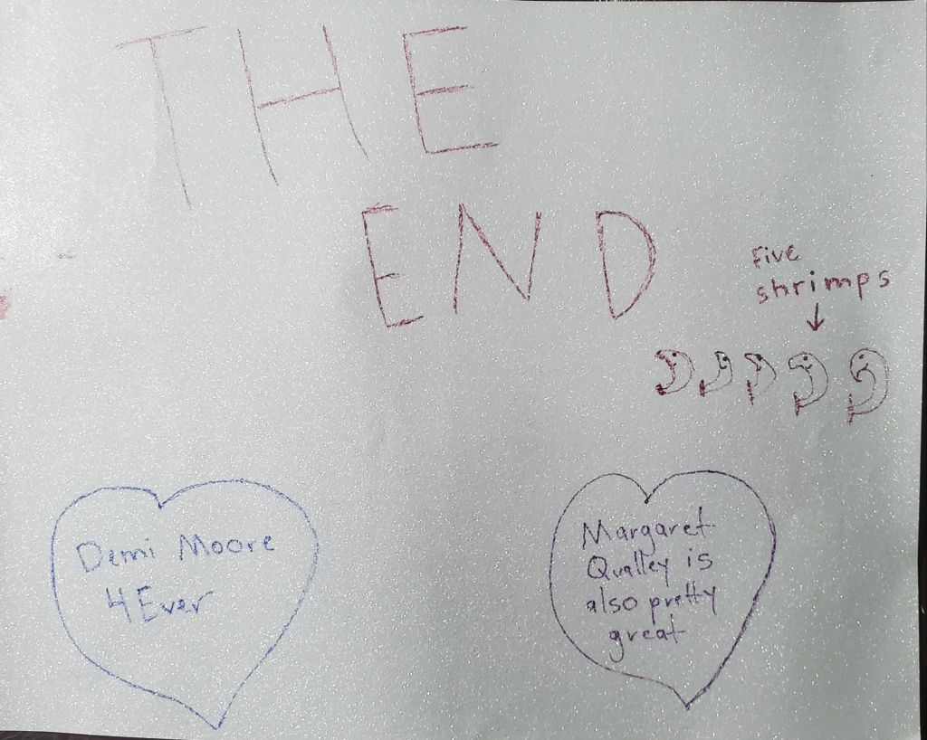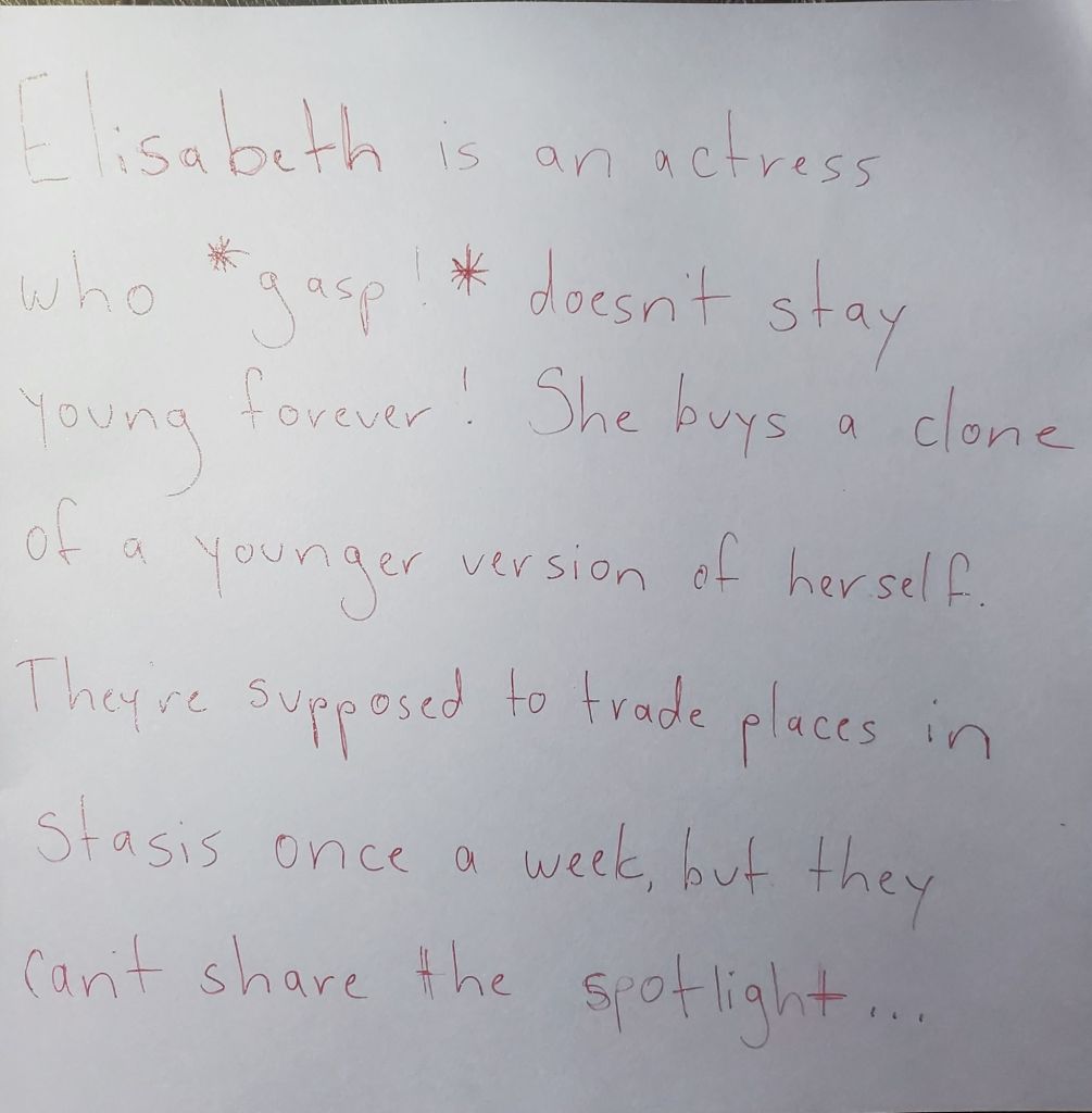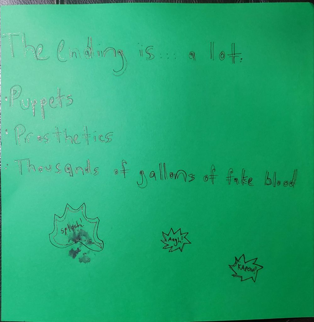 Instagram reel! My oldest kid filmed, and my middle shows up to be pelted once again, this time with fruit, because I don’t have a firehose or fake blood. The cue cards are below.