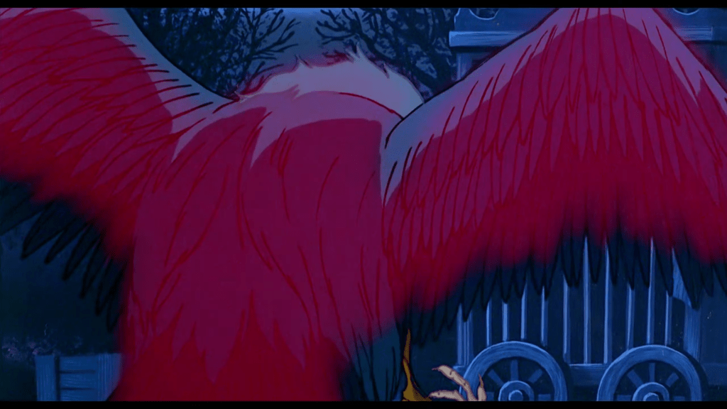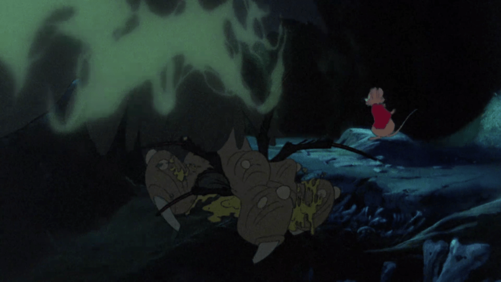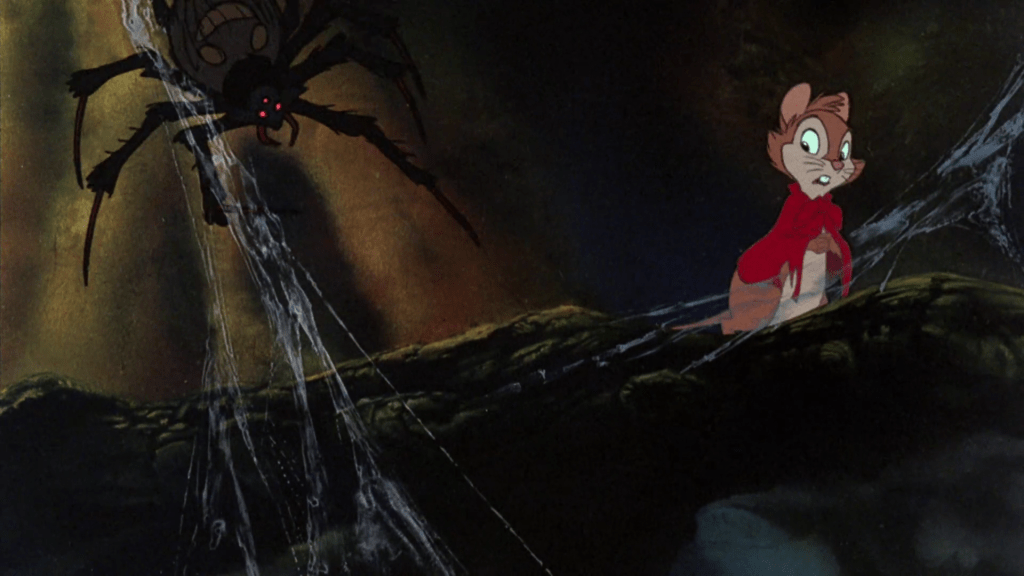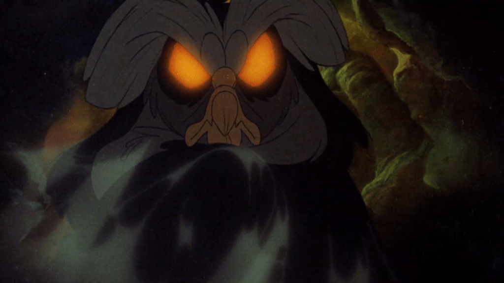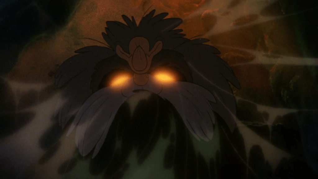 Lookie here: Mrs. Brisby ventures off to see the Great Owl, not generally a friend of rodents. She is followed by a gigantic, terrifying spider, drooling with the anticipation of eating her. The Great Owl crushes it to goo, shocking Mrs. Brisby. We then see that his head is upside down, and he flips it around. For good measure, his eyes are glowing and he’s completely covered in spiderwebs.