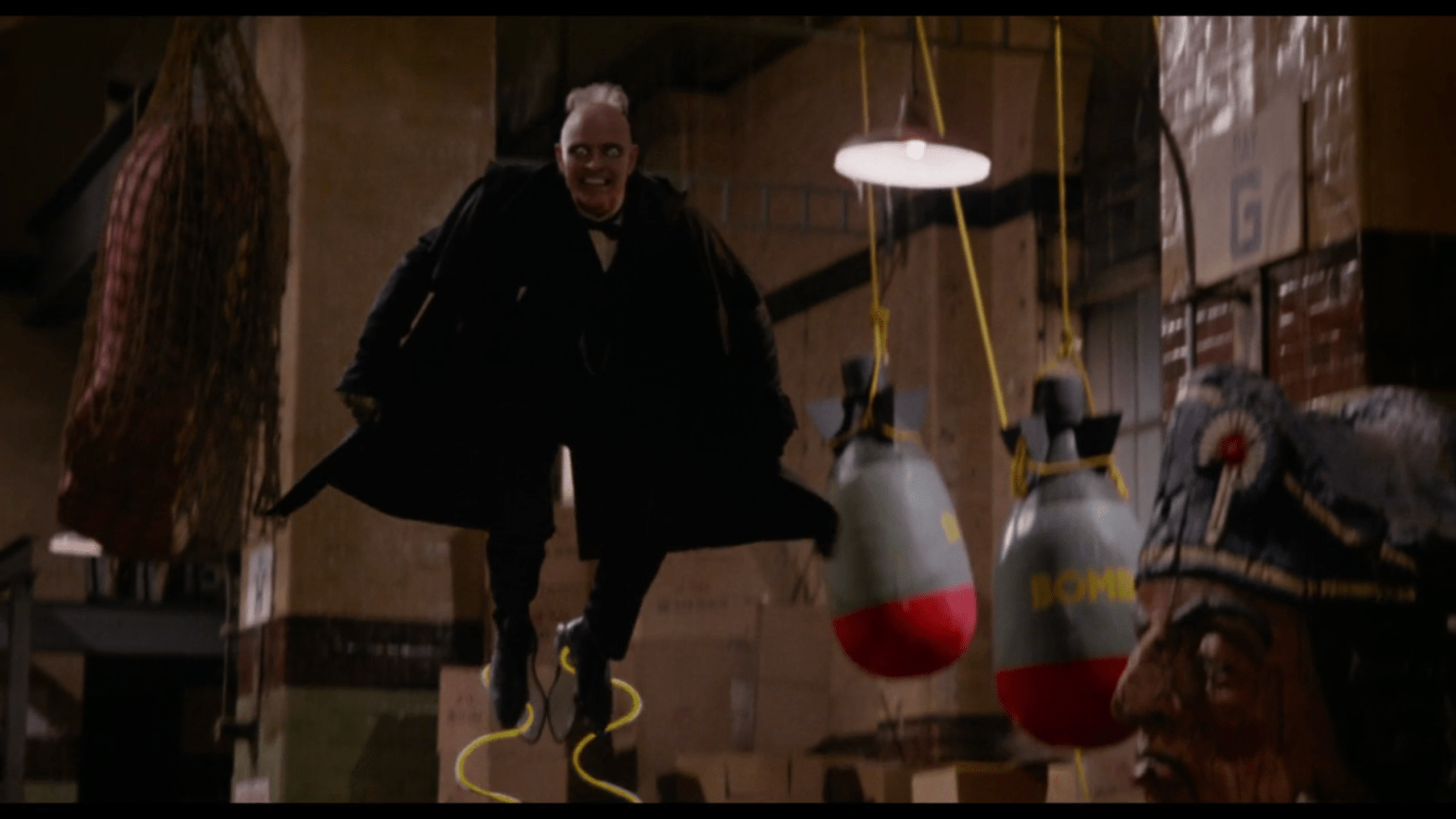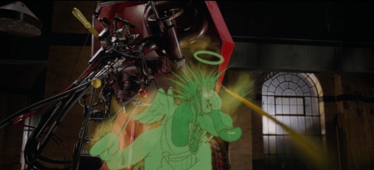 Or (*38-year-old spoiler) the scene when Doom is revealed to himself be a cartoon. He’s flattened with a steamroller, while, as the closed captioning states, “screaming” and “gibbering.” His fake eyes fall out to reveal crazed animated orbs, and he wastes no time attempting to kill everyone around him with his toon superpowers.