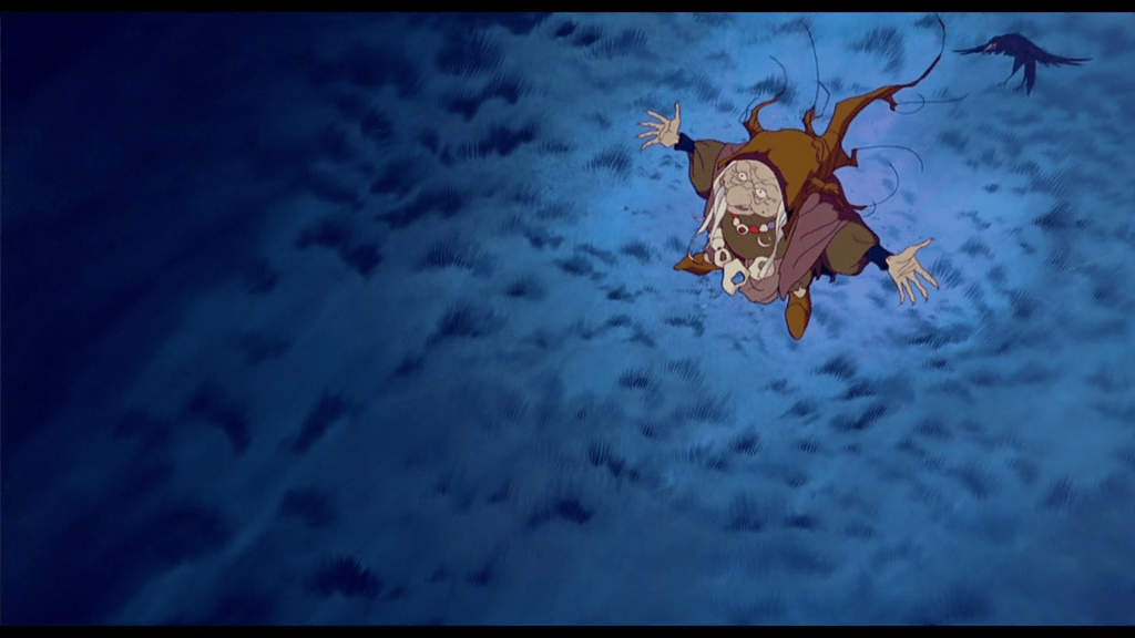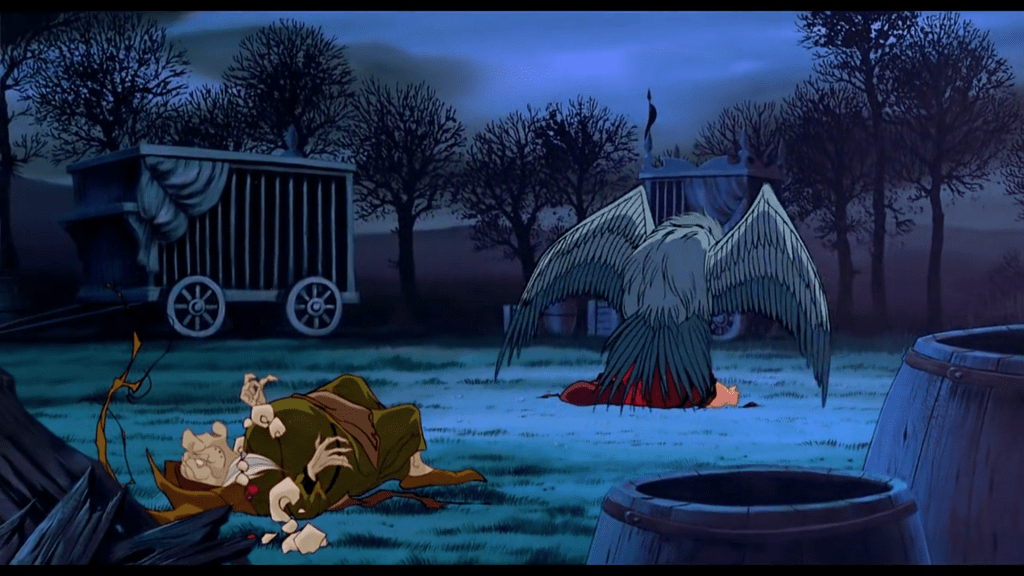 Consider the following sequence: the unicorn has been taken prisoner by carnival owner Mommy Fortuna. She’s also in possession of a harpy, which is REALLY pissed about being in a cage. Does Mommy Fortuna care? Nah. She’s like, “Welp, she’ll kill me one day. Whatevs. Yolo.” The unicorn frees the harpy, which by the way has three boobs just a-hangin out, nipples and all, and may I remind you this movie is rated G, and she indeed kills Mommy. You can see her corpse in the foreground as the harpy also goes to town on Mommy’s fuckwit assistant.