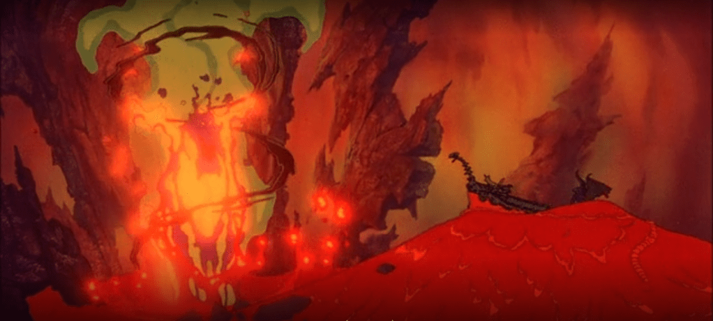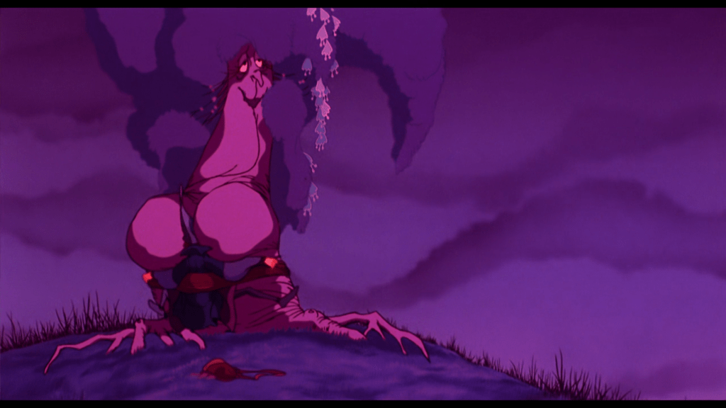 Also disconcerting is the scene when Schmendrick is tied to a tree that becomes sentient and acts distinctly sexually harass-y. She virtually smothers him with her big tree bosom.