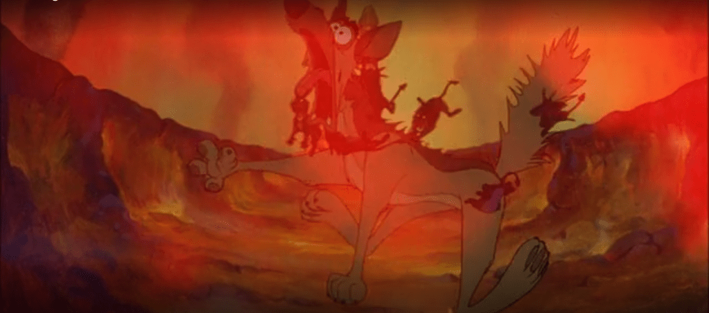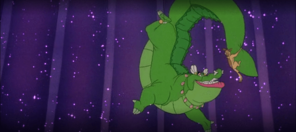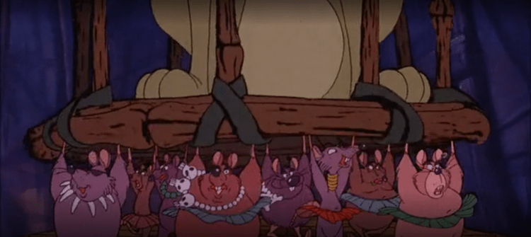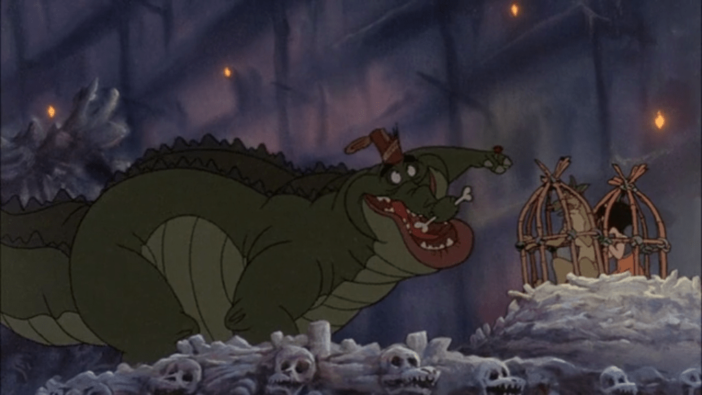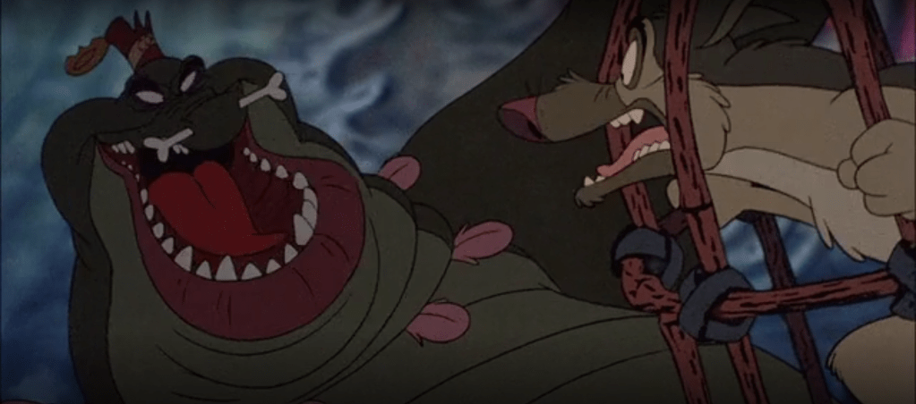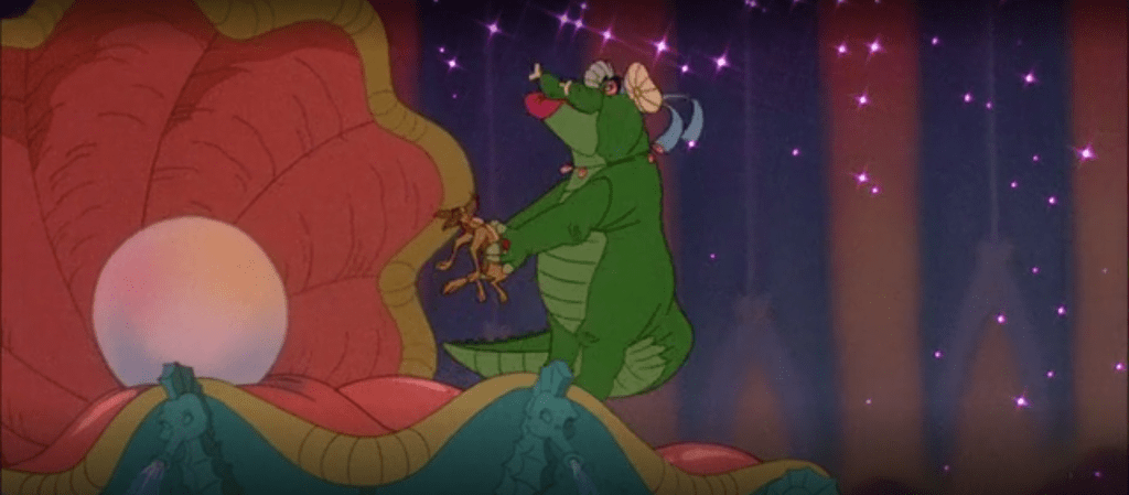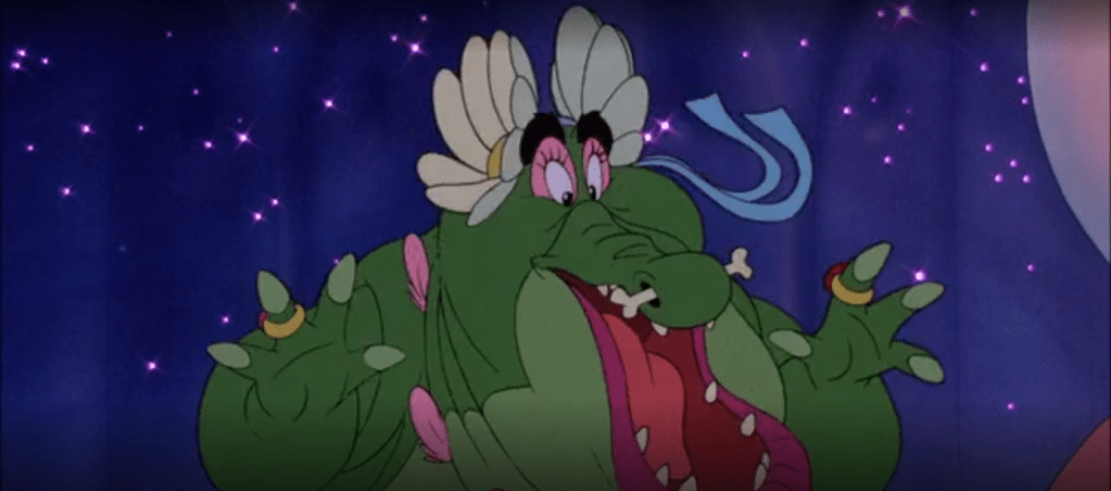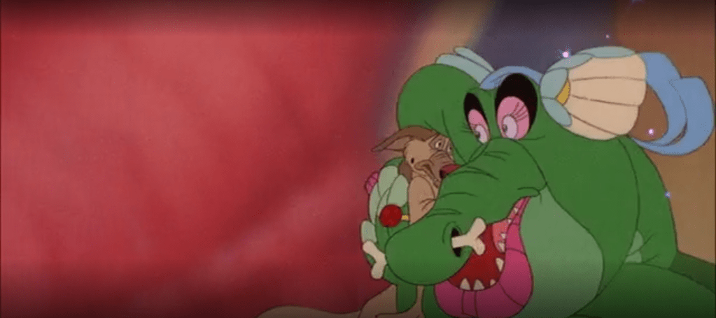 However, the far more disturbing scene is when Charlie and Anne-Marie are held hostage by a gang of rats that appear to be what white people think African people look like. Anne-Marie is unable to communicate with them because “They talk funny.” Then their boss shows up, an alligator with a bone through his nose and decidedly more generous lips than a cartoon alligator would typically have. And yes, it is a Black gentleman who voices him. Not only is it blatantly offensive, it has such little bearing on the plot that it would go on to spur its own movie trope, known as the big-lipped alligator moment. To add insult to injury, the gator goes from menacing to a fawning gay stereotype after his attempt to eat Charlie results in a howl that impresses him with its musicality. (Which is ironic because voice actor Burt Reynolds garnered a lot of complaints about Charlie’s singing.) The reptile dons a flowered headpiece and grows eyelashes and makeup out of nowhere and sings a love song to Charlie about making music together.