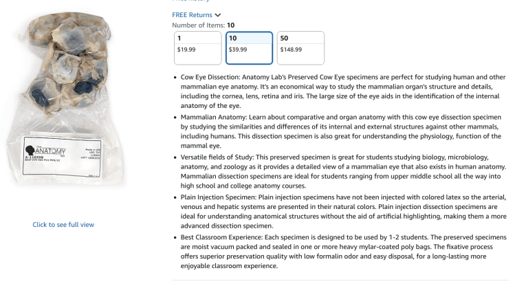 When I stow, I have a series of plastic tote boxes that I reach into and get products out of. I scan them, check my computer screen to make sure what I scanned matches what the computer thinks it is, then I stick the item in a pod. I never know what I’m going to find in the totes. Often it’s just basic stuff like books or crackers or weighted vests. But sometimes I’ll scan a nice, nondescript box and check my screen to see it’s a dildo, with a nice, graphic depiction in all its veiny glory. Or, as what happened the other day, I picked up a bag that felt wrong. To borrow an adverb from Andrew Michael Hurley’s novel Starve Acre, it squished spongily. I scanned it to find out that it was freeze-dried cow eyes. Just a bag of eyes, intended for dissection. I’m not squeamish, but I was gagging.