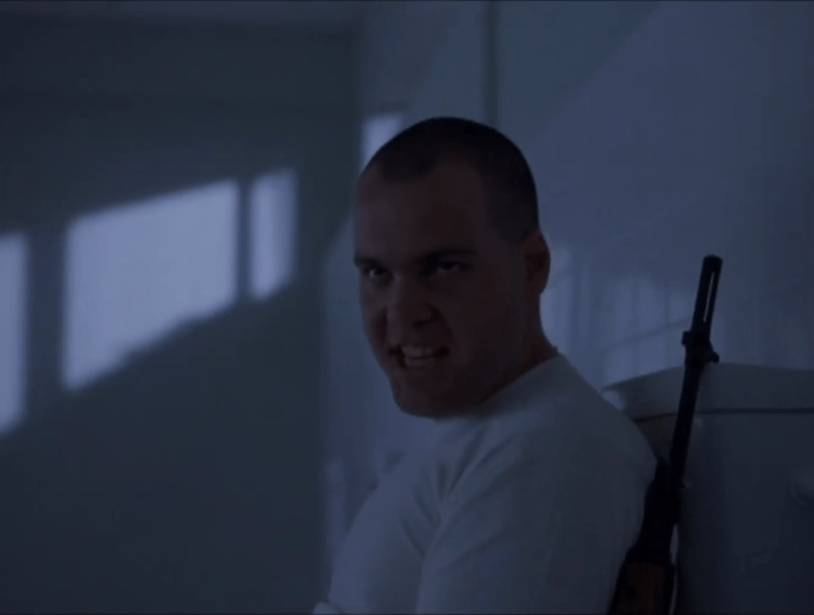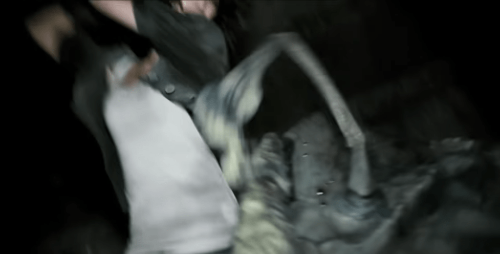 A good deal of the plot has to do with guys pining away for ladies, and frankly I’m much more interested in the monsters than in Hud creepily staring at Marlena or Rob playing knight in shining armor to the profoundly whiny Beth. (Though to be fair I’d be profoundly whiny too if my apartment building fell on me.) The female characters leave a lot to be desired. Lily does little more than scream and cry, though she is pretty hardcore to be traipsing around the wreckage in high heels and then barefoot. Marlena is the most respectable of the bunch, clobbering extraterrestrials (see below–it’s terrifically difficult to get good stills from this movie, but I did my best) and stoically cleaning her nasty wounds with bottled water and cracking jokes–but not in a cheesy action movie one-liner way. The dialogue does come across as very natural.