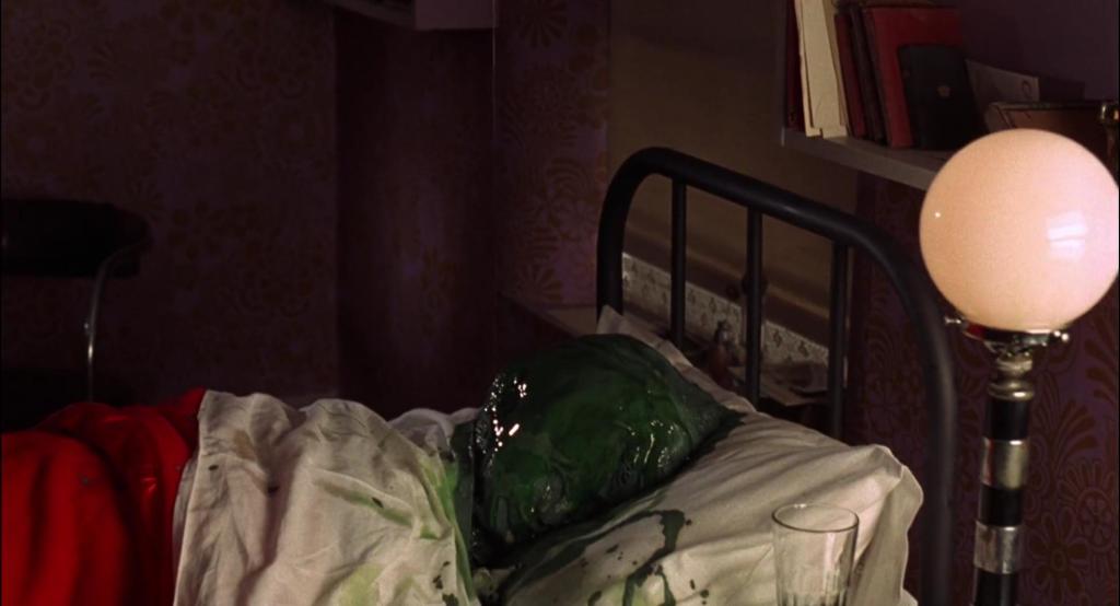 This film is just a delight. It’s terribly corny and riddled with plot holes (most of which spring from trying to create deaths from plagues that are more bothersome than deadly), but it’s darn entertaining and funny, too. One of my favorite scenes is when Dr. Longstreet (Terry-Thomas) is watching what appears to be an ancient porno. His maid comes in and scolds him—for missing his dinner. I was also amused by the unlikeliness of the scene when Nurse Allen (Susan Travers) meets her doom. While she sleeps, Phibes covers her face completely with a viscous green goo (which she sleeps through), then releases locusts in her room. When the detectives find her, sans face, she’s lying in the exact same position we saw her in last, which leaves us to assume that she also slept while the bugs ate her—I guess she pulled a double shift that day. (Though to be fair, a reader did point out to me she remembered Allen saying something about taking a tranquilizer before bed.)