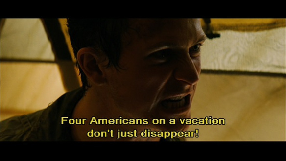 In some ways, the movie is hard to take seriously. While the events are wrenching and the main characters are sympathetic, it’s still premised on the idea of white American tourists being menaced by sinister, primitive villagers. Gah, look at these privileged assholes!