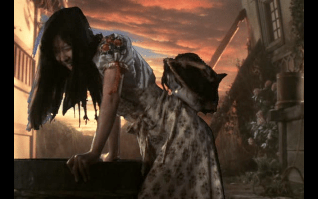 Since the film was made in the 1970s, one can expect a certain degree of awfulness, and this one is no exception. The special effects are terrible and the sets are clearly paintings. Good thing this is a horror comedy. Despite the serious subject matter (such as Auntie’s husband dying in World War II and multiple on-screen killings) there are quite a few funny moments. For example, the girls’s hapless teacher Mr. Togo (Kiyohiko Ozaki) falls down a flight of stairs and gets a bucket stuck to his butt; while he’s calling the girls to say why he’s going to miss their train, a kid is standing behind him hitting the bucket with drumsticks. Which leads to my next observation: the wackiness. Much of the comic relief comes from the flat-out weirdness of what’s happening. Death comes in the form of random inanimate objects coming to life and pummeling people. One of my favorite scenes is when Gorgeous finds Mac’s severed head, which promptly bites Gorgeous on the ass, exclaiming, “Tasty!”