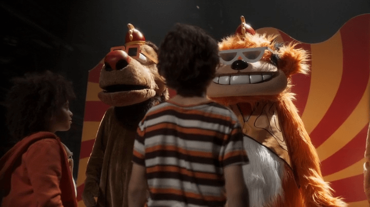 In place of vignettes involving outside characters, the Splits pull audience members for a Double Dare-style challenge. They also have a human counterpart, Stevie (Richard White). Our main protagonist, Harley (Finlay Wojtak-Hissong) is a nine-year-old boy who’s very keen on the Splits. His mother Beth (Dani Kind) has arranged to see a live taping with the family: Harley’s stepfather Mitch (Steve Lund), older brother Austin (Romeo Carere), and acquaintance Zoe (Maria Nash). Unfortunately, this is also the day that the show is being canceled. Further unfortunately, the Splits have just gotten an upgrade that embeds the idea that “The show must go on” permanently. So they decide to give the audience a show they’ll never forget–provided they live to see it.
