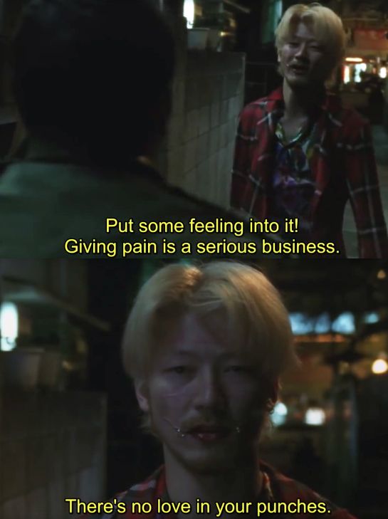 Ichi is an interesting character. He seems innocent and beaten down by life and manipulated by others, but he inflicts such violent deaths. He splits a dude in half! Meanwhile Kakihara is so cocky. And a snazzy dresser!