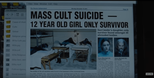 Richard (Richard Armitage), his wife Laura (Alicia Silverstone), and their kids Aidan (Jaeden Martell) and Mia (Lia McHugh) are going through a rough patch. Richard has decided that he’s in love with Grace (Riley Keough), one of the subjects of a book he wrote about cults: Grace’s father was a Jim Jones-style leader of a sect that committed group suicide. Richard informs Laura that their separation should commence into divorce, and Laura promptly ends her life. Cut to six months later, when Richard decides it would be a swell idea to take Grace, Aidan, and Mia up to the mountains for a Christmas vacation, even though Richard has to work, leaving Grace alone with the kids. What is already a monumentally shitty situation escalates into worse and worse scenarios when their stuff mysteriously disappears (including Grace’s pills and everyone’s winter coats), and the power goes out, and the generator breaks, and their phones die, and also the nearest town is miles away and there’s major snow and no car, and they’re running out of food, and Grace’s dog is gone.