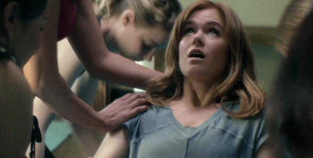 Expanding on the depictions of control, the movie puzzles me; it has a strong Rosemary’s Baby vibe, what with everybody (especially men) telling Evie she’s crazy and trying to regulate what she does with her own body. It could have been a story about a strong woman refusing to ignore her powerful instincts. Instead it’s a story about a hysterical woman who lets everyone push her around. David isn’t a villain; he’s as sweet and supportive as he is domineering. He’s frequently condescending; it’s impossible to watch him and not be reminded of John in “The Yellow Wallpaper” (“She shall be as sick as she pleases”), but just as frequently he’s a kind and decent husband. Every time Evie is scared, which is constantly–Evie spends the majority of her time on screen whining, crying, or screaming–she collapses into his arms, and he lovingly soothes her. As if it weren’t enough that Evie is a total wimp, there are multiple noxious female stereotypes. Evie and her new friend Sadie (Gillian Jacobs) bond by griping about motherhood with every cliché in the book. Then there’s a prenatal yoga class full of woo-woo weirdos who try to force happy thoughts into Evie with their breath, a segment that’s played for laughs (despite the still below that makes it look like they’re a cult about to sacrifice her).