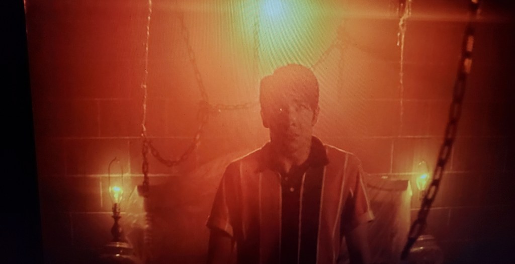 I tend to be skeptical of depictions of the 1980s by millennial filmmakers, who were but babes during the decade, but the ’80s accoutrements are skillfully displayed without overshadowing the aesthetic in general: crimped hair, a Walkman, arcade games, blue and pink eye shadow, middle-of-the-night static on TV, and of course the rotary phone on which one makes the titular calls. Visual references to horror movies are plentiful (but not obnoxiously so), from The Exorcist to Poltergeist, but two of the most striking are ones from movies that were released in 1987. There’s an early scene that takes place at a carnival that’s very reminiscent of The Lost Boys, and in one scene there’s a bedroom set overhung with chains, much like in Hellraiser–see the image two paragraphs below.