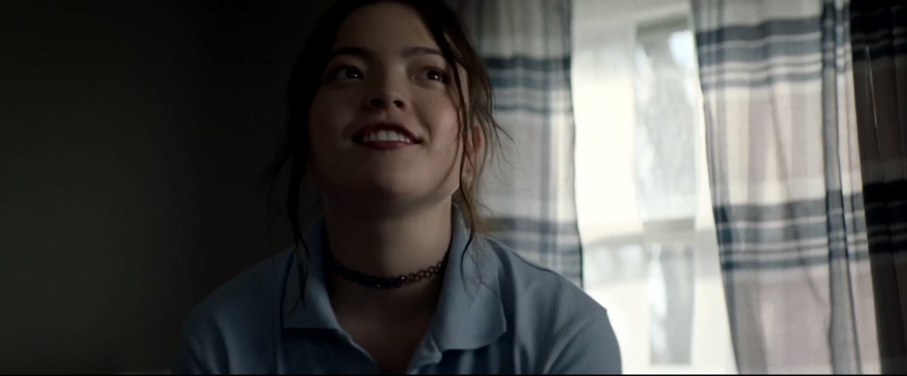 Moving on, while in some ways the film is pretty by-the-numbers, it also cheekily plays with audience expectations. We have the standard tropes like the naughty teen drinking party and Ben wandering slowly with a flashlight while investigating a noise. The last twenty minutes or so are particularly formulaic. However, the cold opening that establishes the characteristics of the monster with throwaway characters, despite being a frequently used technique, is still eerie and solidly written. Meanwhile, the movie can be playfully unpredictable. When you expect jump scares, there aren’t any. When you expect Ben and Mal to kiss, he throws up on her instead. The choice to frame the movie from Ben’s point of view instead of Abbie’s or Ty’s opens up more possibilities for gruesomeness and boundary-pushing. It has some wonderfully scary moments, like the scene when Dillon comes upon a freshly possessed Abbie, whose skin is literally crawling with who knows what. She turns around and gives him an uncanny stare.