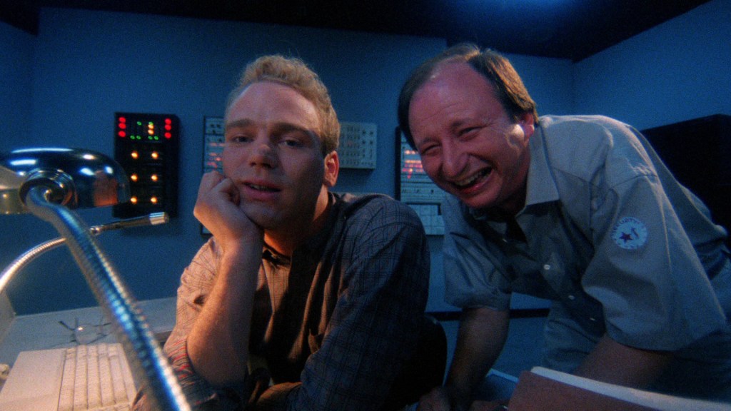 Michael’s brother-in-law and resident computer expert David (Merritt Butrick) is an interesting character. It’s possible to read him as gay, in a subtextual, dated way. While pranking gym members, he stops to watch a super muscular guy and says, “Now there’s something even I can’t improve on.” He’s majorly prissy and scoffs at Michael for threatening him with “jock violence.” As he tells the detectives, “Assaulting women isn’t my style.” When Catherine, his dead twin sister, takes over his body, he wears her clothing and later morphs into her. There may be one overtly gay character, brief though he may be; in response to a woman hitting on him, a gym member replies, “I’m beta, you’re VHS.” Speaking of dated.
