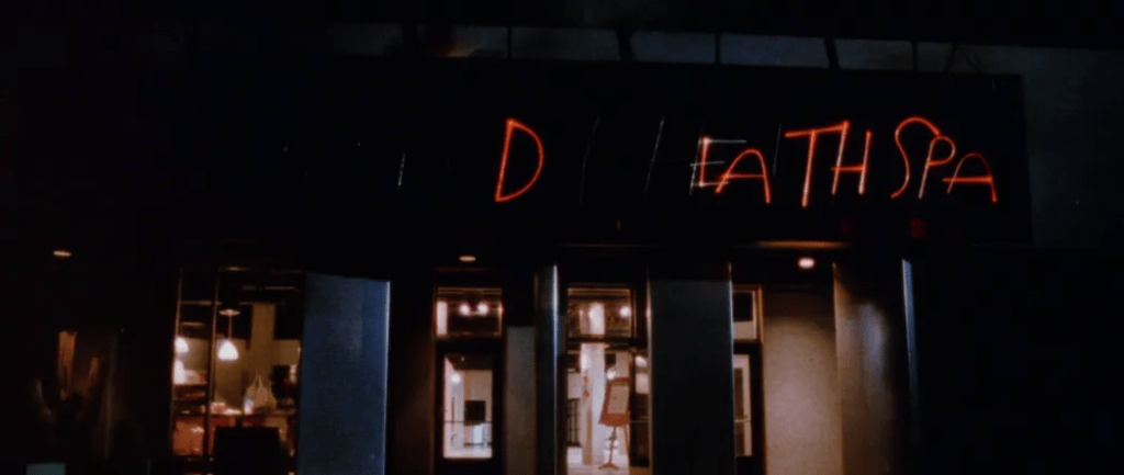 Oh, where to begin? I first became aware of this movie because of a Cracked article, “The 7 Most Half-Assed Monsters in Movie History“. I read it years ago, but I was unable to find Death Spa until recently, since it’s pretty obscure. Half-assed indeed! The writers run out of methods to do away with people really early on and resort to utter nonsense. Ask yourself: Do gyms have freezers? And if they do, why do they contain the shrieking eels from The Princess Bride? We’re talking acid from ceiling pipes, a butterfly press crushing a dude’s internal organs, exploding mirrors, tiles flying off shower walls (the ghost is also really good at sort of injuring people). The movie is violent as fuck, but logical (or scary) it is not.