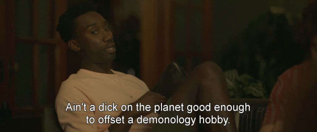 Keeping with the emphasis on inclusivity, there’s a gay couple in the movie, Brianna’s brother Troy (Nathan Stewart-Jarrett) (who, in a cute bit of banter, Anthony calls his muse) and his feller Grady (Kyle Kaminsky). They’re likable, but Troy is a bit stereotypical, flamboyant and dramatic. In one scene he’s telling a scary story by candlelight and ends with a gasp of “Is my Rosé still in the freezer?” Grady is the less clichéd of the two; Troy offers him up as Brianna’s protector, assuring her that Grady can “stomp” Anthony. While the most screen time is devoted to the heterosexual main characters, in defiance of movie tropes yet again, *spoiler* they both live to the end of the movie.