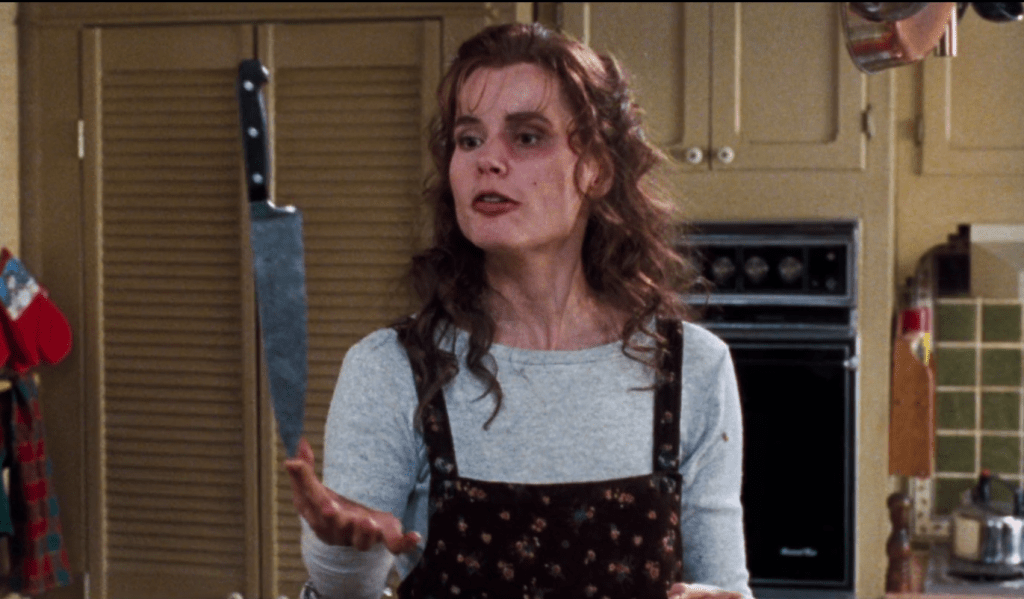 10. [Charly (Geena Davis), a CIA agent, has suffered grave injuries and collapsed on the ground right next to a bomb. Her daughter Caitlin (Yvonne Zima) is trying to rouse her] “Would you stop it? Stop being a little baby. Get up now. You’re not dead. Don’t you die. You get up now. Life is pain. You just get used to it! So stand up right this minute, Mommy.” (The Long Kiss Goodnight, 1996)