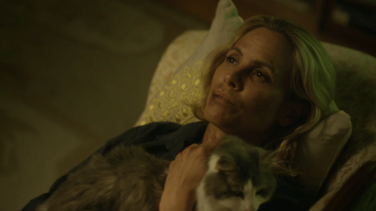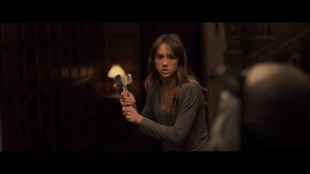 Maddie is a deaf and mute writer living in a secluded area. She’s ambushed by a killer disguised in a smiling-noncommittally mask. She’s given to some understandable bouts of crying, but mostly she keeps her cool and is always strategizing. She doesn’t let her lack of hearing make her an easy victim; on the contrary, it gives her smart maneuvers like hiding under her porch and feeling for The Man’s footsteps. She’s a fighter, able to steal his crossbow and knock him off the roof. In one scene, we’re treated to her thoughts, in which she decides that since she can’t run, hide, wait, or go outside, her only option is to kill him. *Spoiler alert, Maddie saves her cat.